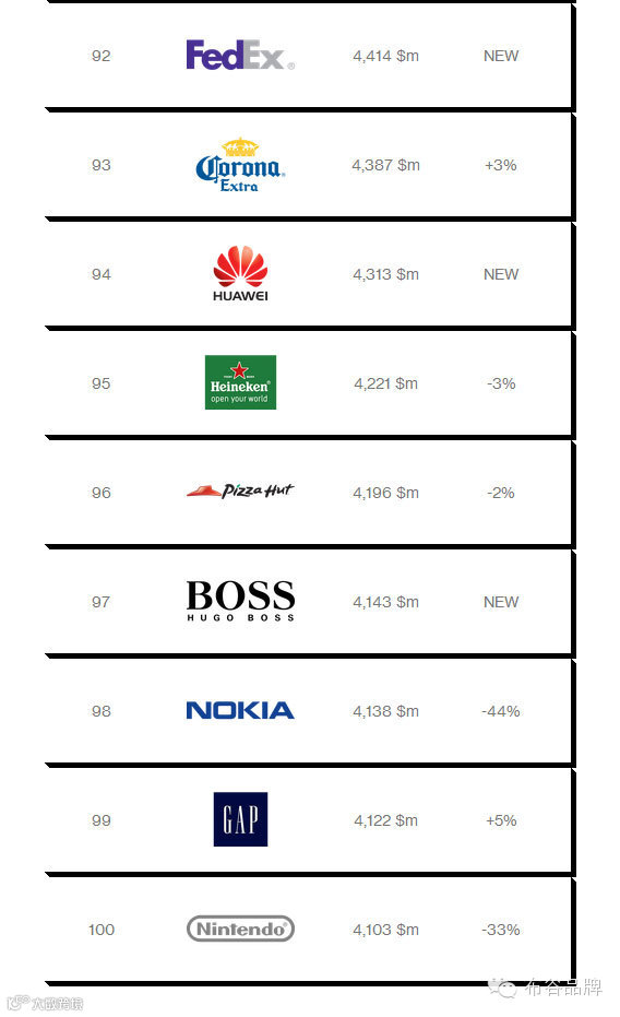 华为(排名94),作为中国通信与信息网络设备的供应商,成为首次上榜的中国品牌。华为的收益不只是在中国国内,其65%的收入来自海外,而且横跨欧洲中东以及非洲呈直线增长,这使华为能够迅速崛起,成为全球最大的通信设备供应商,也是目前仅次于三星和苹果的世界第三大智能手机的制造商。这个中国品牌也是5个今年榜单中新晋品牌之一,其他分别是DHL(#81),路虎Land Rover(#91),FedEx(#92)和雨果博斯Hugo Boss(#97)。