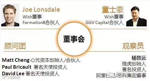 此外,我们基于Wish在C轮的投资情况,发现其拥有豪华的董事会阵容。整个董事会除了创始人之外,还有来自Formation8的Joe Lonsdale和GGV Capital的童士豪。其他的投资人则以观察员或顾问的身份参与到Wish的决策中。如下所示: