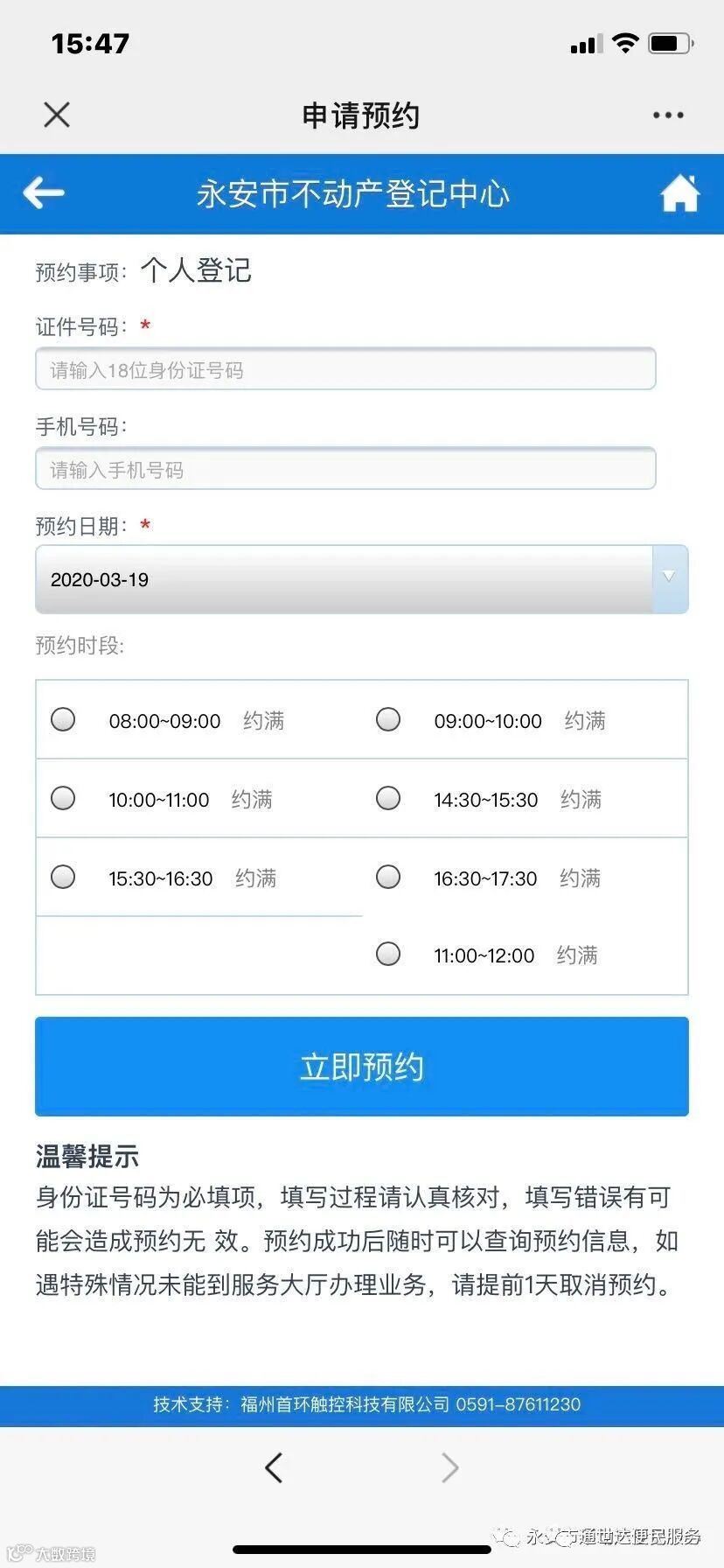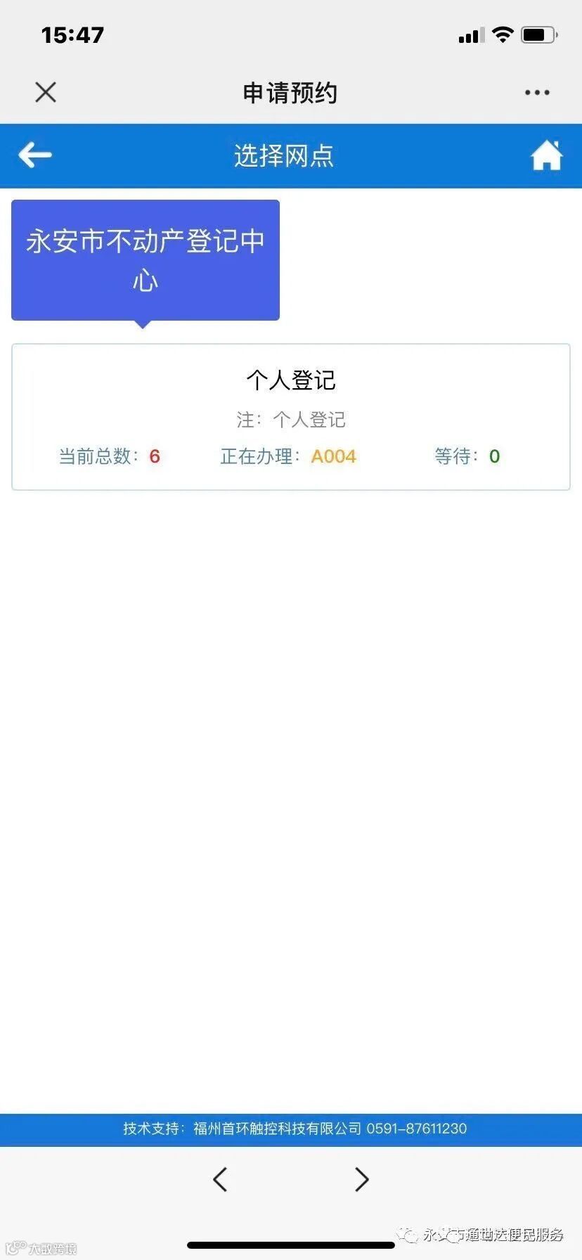 2、预约取号:添加关注后,点击第一个菜单“中心指南”选择“微信预约”进入取号界面。申请预约:选择永安市不动产登记中心 — 个人登记,输入身份证号码及办件人手机号码,选择预约时间,点击立即预约确定提交。预约成功之后,系统提醒预约成功并推送一个预约成功的消息模板。