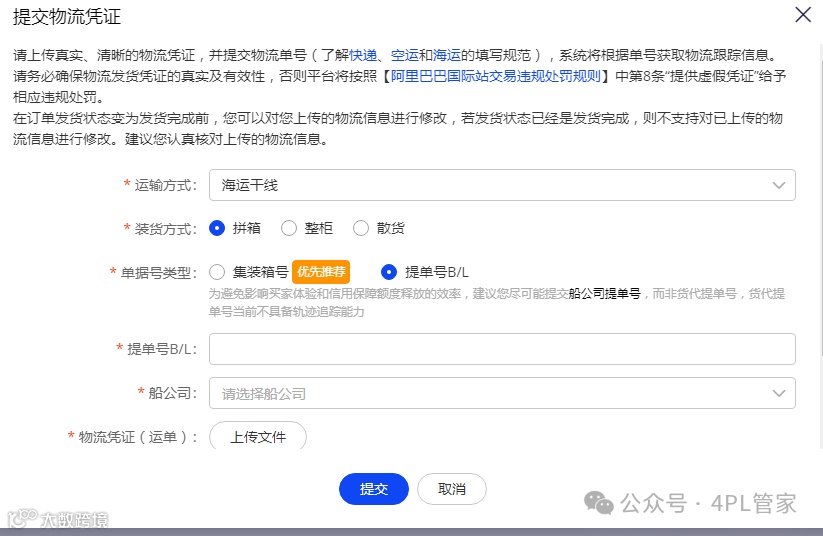 阿里国际站后台需要上传这类信息时,货量较少的时候,可以选择快递运输,上传该国家的快递单号和轨迹截图即可,货量较多的时候,可以选择上传HBL,也会视为有效。