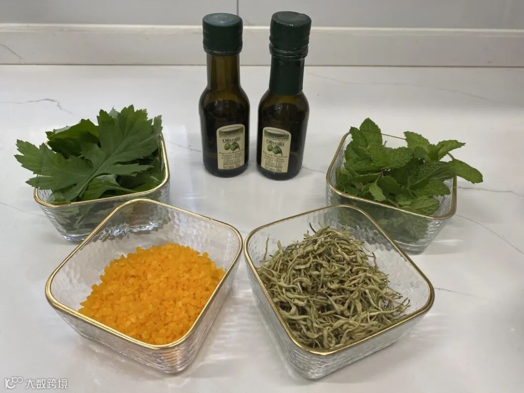 新鲜艾草65克、新鲜薄荷80克、金银花15克、橄榄油160毫升、蜂蜡50克。