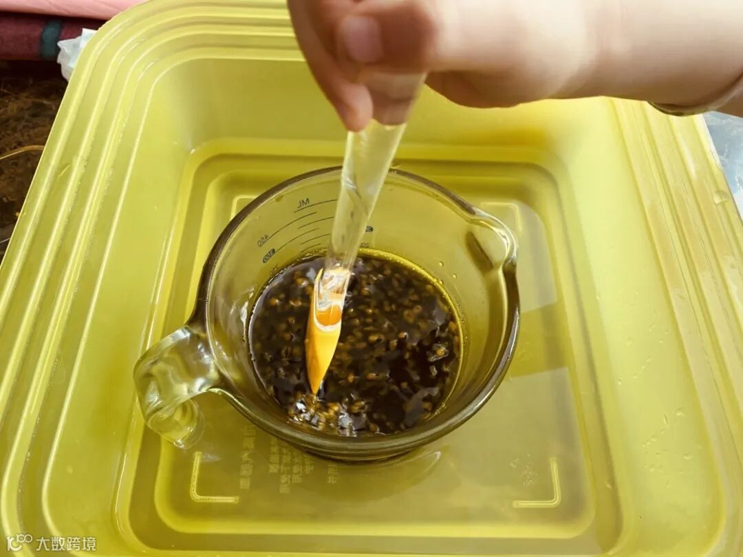 按比例(油:蜡=3:1)称取蜂蜡,加入过滤后的浸泡油中,隔水加热至蜂蜡完全融化。