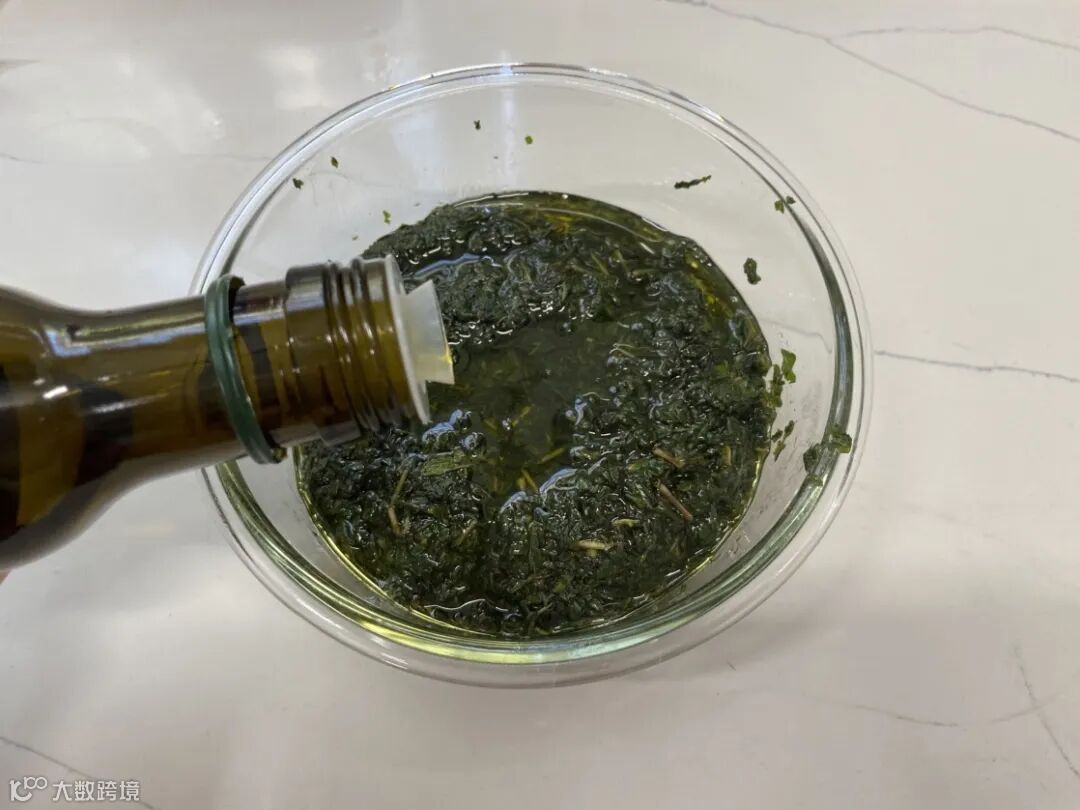 将原材料打碎后放入干净的容器中,倒入橄榄油,浸没过所有原材料,隔水炖煮1.5小时。隔水加热时水温勿超85℃,避免破坏精油成分。