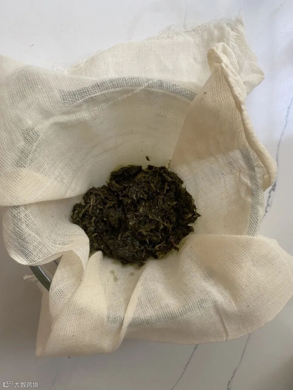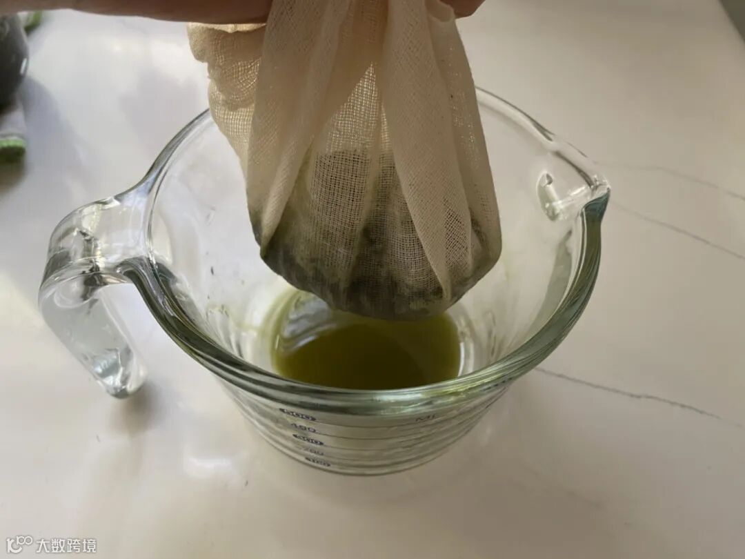 用双层纱布过滤出薄荷艾草油,挤压纱布以充分提取油脂,保留清澈的浸泡油。
