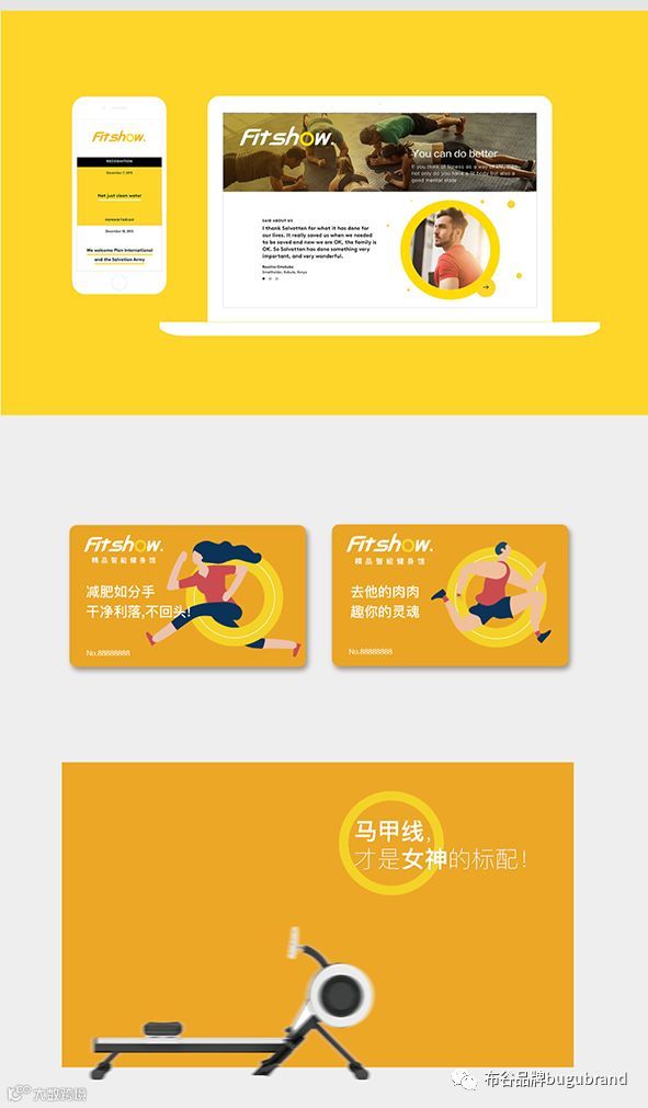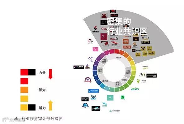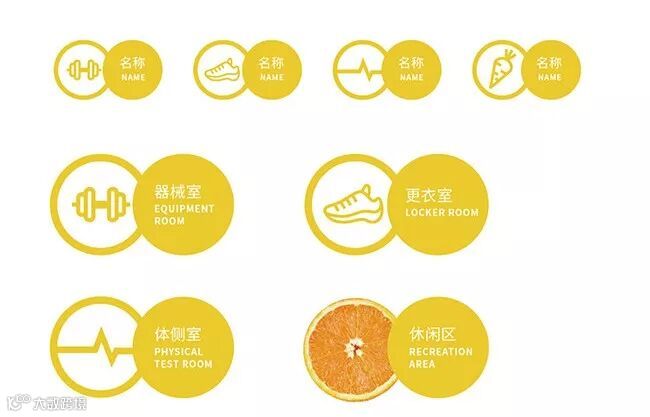 将品牌色定位在行业共识区,可以利用用户对健身房行业感官识别的惯性,降低用户对服务和品牌的误判。根据fitshow品牌的人群定位及精品、智能的属性,将品牌色锁定在柠檬黄到阳光橙的区域。