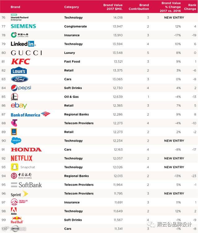 今年在排行榜上颇为瞩目的还有中国腾讯(排名第八),其社交平台微信的用户量持续上升,品牌价值增长了27%,达到1083亿美元,排名首次进入前十。按品牌价值的百分比增长计算,Adidas上升速度最快(增长了58%即83亿美元),其次是中国优质酒类品牌茅台(增长了48% ,即170亿美元)。