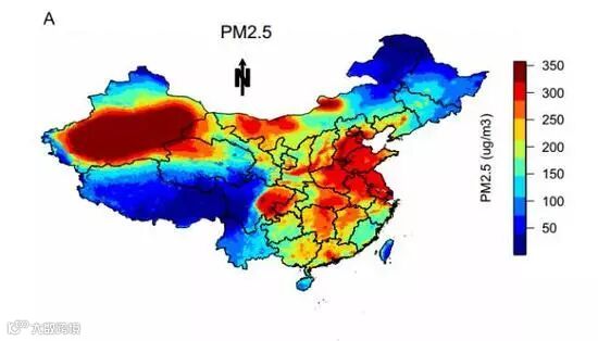 1990至2009年间,中国各地区PM2.5平均值模型图。图片来自Guo et al。, 2016。