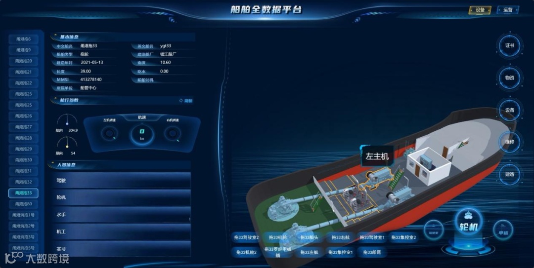 此外,全数据平台界面包含各类型船舶的三维模型,支持多角度查看船舶结构,同时点击船舶具体设备可弹出详细信息窗口,包括设备基础属性与维修保养记录,真正做到“一船一档、一机一账”的精细管理。
