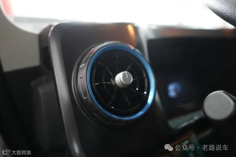 车内出风口均采用了飞机涡轮风扇引擎的样式,高端、精致,出风口外侧还采用蓝色饰条包裹。
