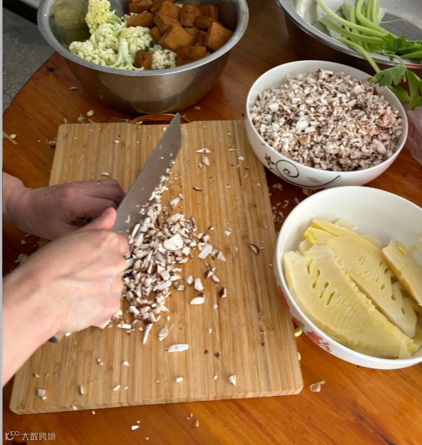 起锅烧油,依次加入切丁的笋干、豆腐干、雪菜,再倒入一小碗雪菜汁一起翻炒,加入适量生抽和少许味精调味。翻炒完成后放凉备用。