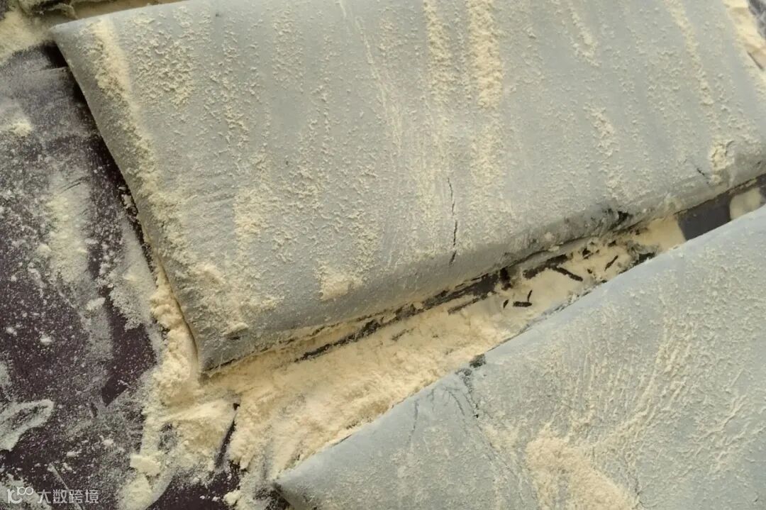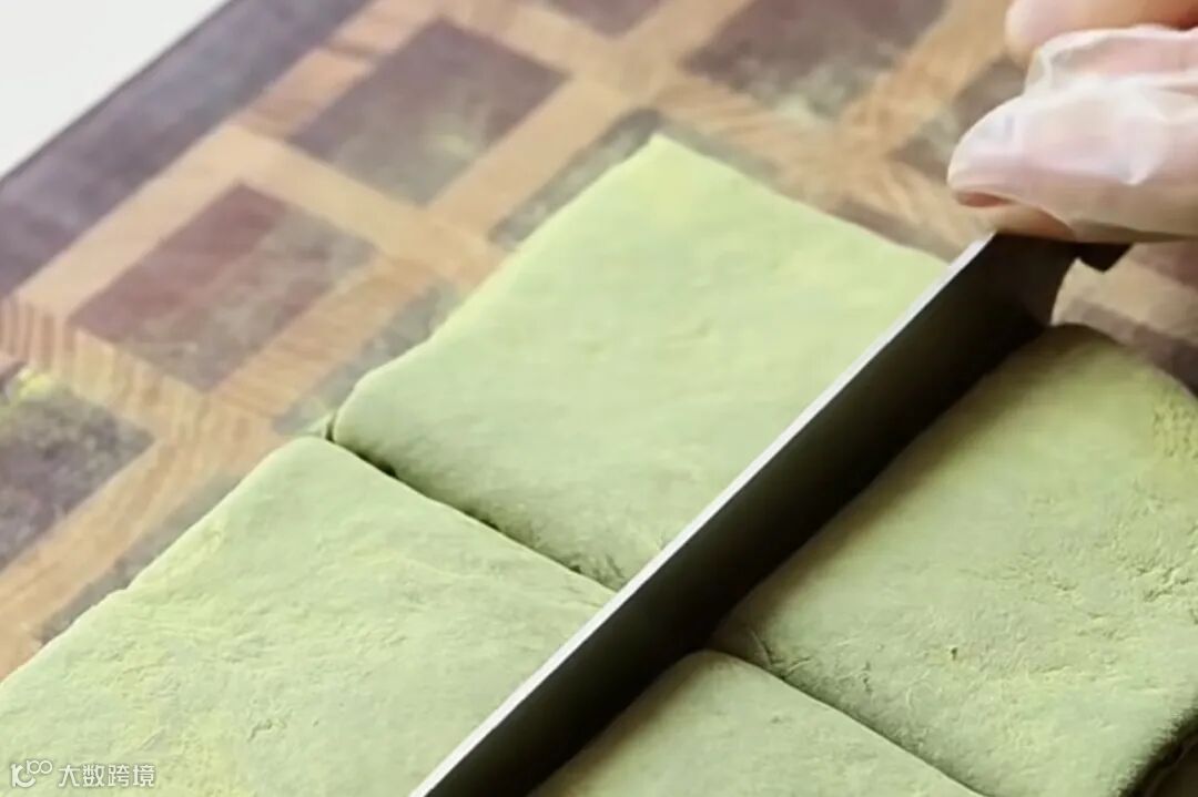 在面板和面团上撒上黄豆粉,擀成厚度均匀的面饼,切成方块。
