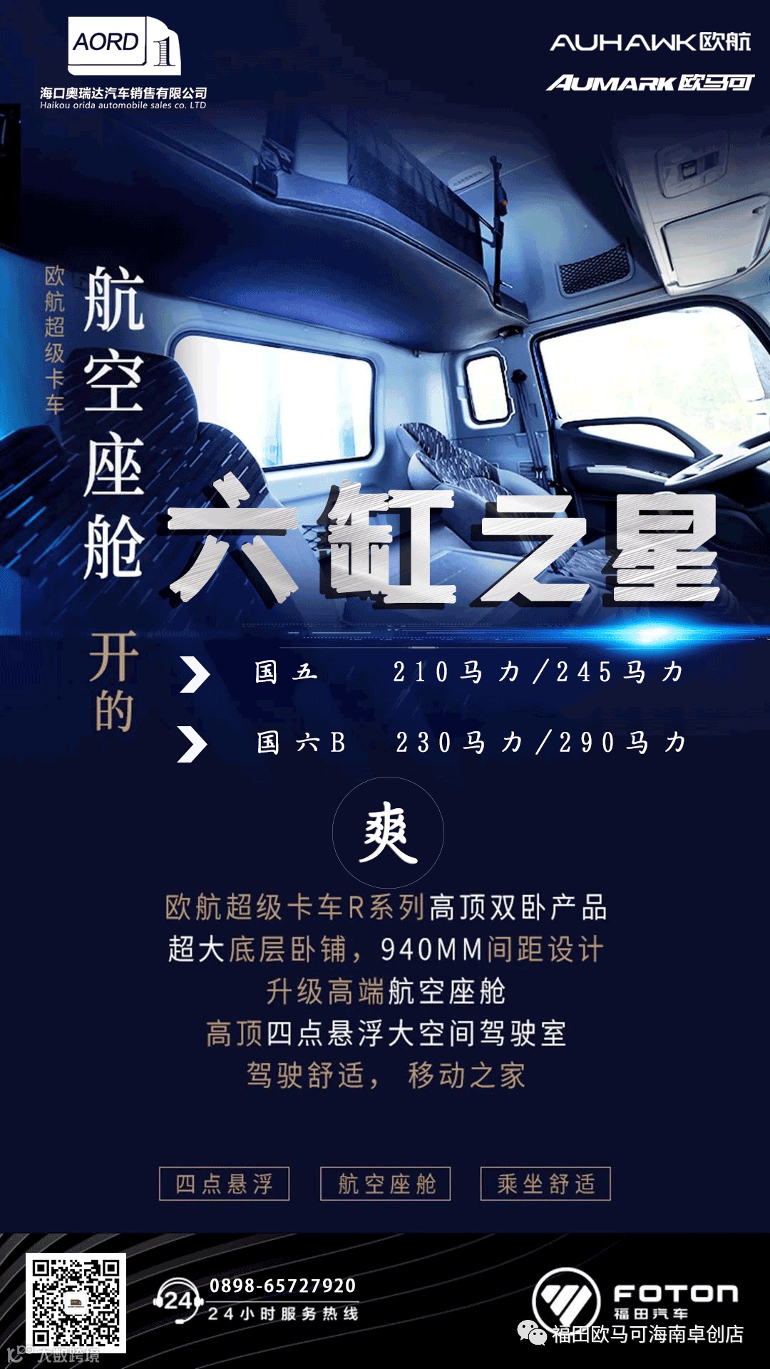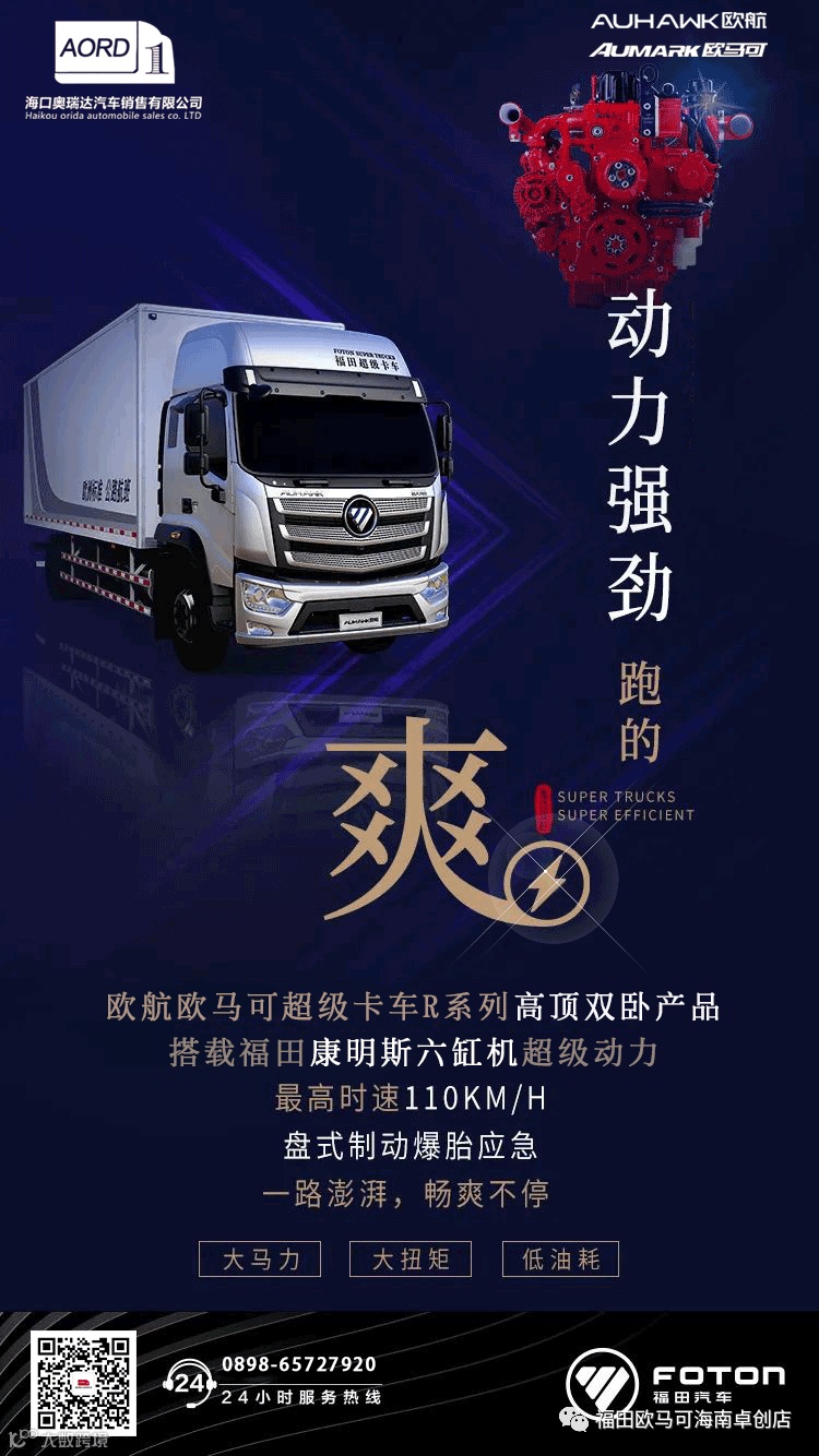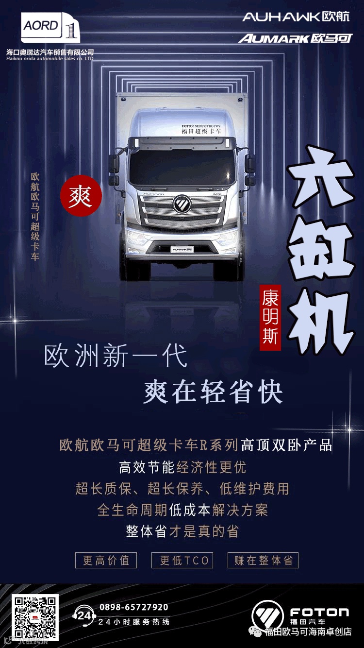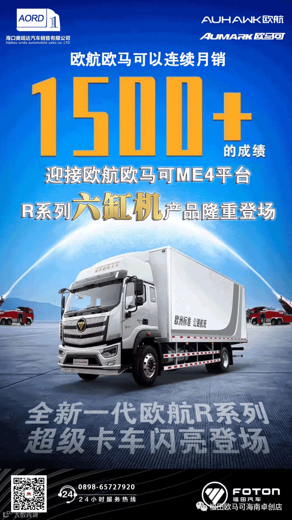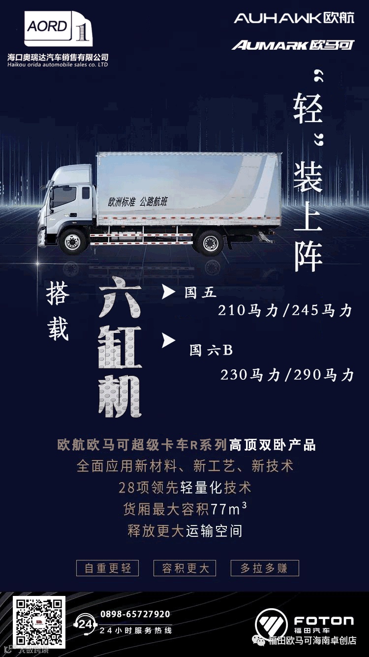 全球高端中轻卡引领者—欧航欧马可海南直营店,主营欧马可S1、S3、S5超级卡车、欧航超级中卡,全系专属匹配康明斯动力,20000公里超长保养,4年不限里程超长质保,整车深度链和奔驰技术,各式车厢覆盖3.2米~9.8米,动力覆盖110马力~290马力,更有四缸机之王康明斯4.5L超强动力40000公里超长保养,5年不限里程超长质保。欧马可S1/S3超级轻卡整车享2年不限里程质保,S5超级中卡整车享3年不限里程质保。全新一代欧航R系列超级卡车闪亮登场,六缸机车型热销中!全系国六b产品一步到位,全面引领行业!