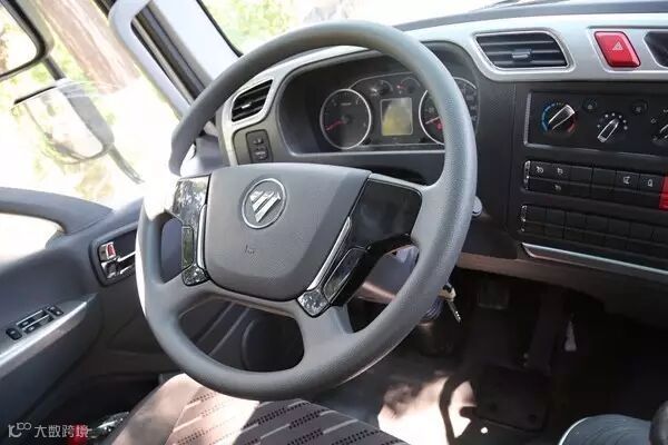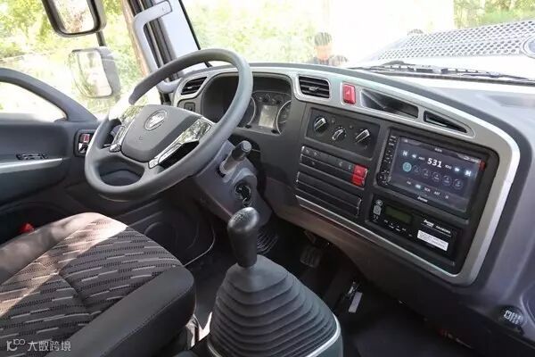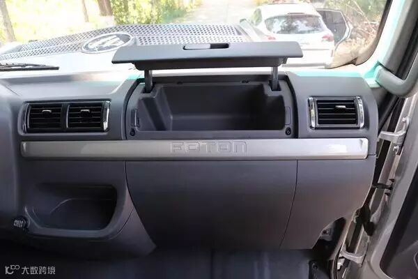 副驾驶前方设计有储物空间,内部空间很大,可放置不少物品,便于长途运输时储物;由这个角度还可看到标准的空调出风口,类似于轿车化的设计,制冷效果也很好。