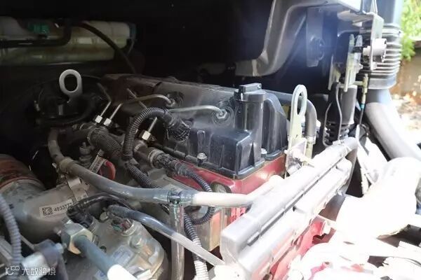前面罩的开启按扭藏在方向盘底部,并没有采用液压举升,而是普通的机械支撑结构。其中我们可以看到各线路均采用不同颜色的区分,这样的好处就是便于维修工区分,便于查找,也是一项较贴心的设计。
