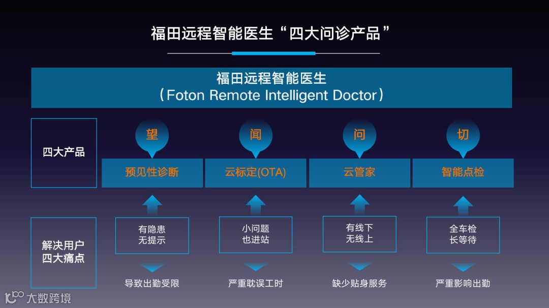 针对汽车智能、网联化技术发展以及用户的全勤追求,欧航欧马可顺势而为,推出远程线上服务。通过智科车联网、专家诊断系统、福田e家等智能服务平台,为客户提供预见性诊断、云标定(OTA)服务、云管家、智能点检等预见性智能服务,通过大数据智能运算,提前对车辆故障进行预判,防患于未然。