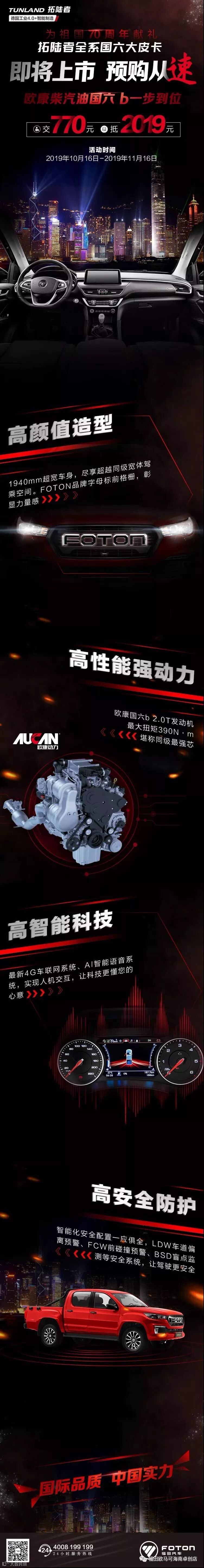 全球高端北美大皮卡—拓陆者,旗下拥有拓陆者E3/E5/E7/S四款车型,10000公里超长保养,3年20万公里超长保修,覆盖5MT/6MT/6AT、两驱/四驱、标箱/加长厢全部车型,货箱长达1805mm、载重达2吨、油耗低至0.38元/公里,更有拓陆者S专属匹配康明斯超强动力177马力、德国采埃孚6AT变速箱、英国莲花四驱越野底盘。