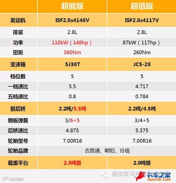 欧马可3系超能版与超值版的区别还是在于动力上,同样是搭载福田康明斯2.8L发动机,超能版无论在功率还是扭矩上都大大提升了,马力甚至比原来的康明斯3.8L低功率版(105kW)还高。