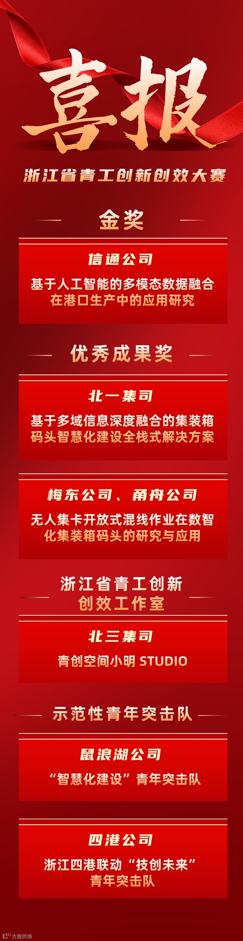 近日,共青团浙江省委、浙江省国资委、浙江省科技厅联合发文公布第六届浙江省青工创新创效大赛结果,经资格审查、专家评审、现场答辩等环节激烈比拼,浙江省海港集团、宁波舟山港集团选送的项目及参赛队伍从各地各单位中脱颖而出,获项目赛1个金奖、2个优秀成果奖,1个青创工作室获评“浙江省青工创新创效工作室”,2支青年突击队获评省级“示范性青年突击队”,充分展现出集团广大团员青年在创新创效中的活力生态,彰显青年创新创效活动在助力集团高质量发展中的鲜明辨识度。