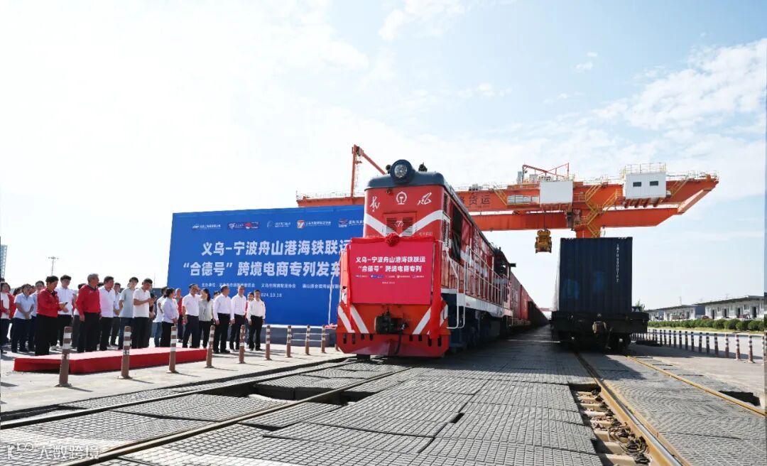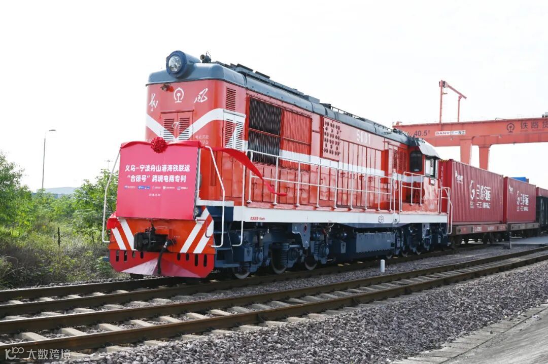 10月18日,一列满载100标准箱跨境电商货物的火车从义乌西站鸣笛启程,标志着义乌至宁波舟山港海铁联运“合德号”跨境电商专列成功开行。