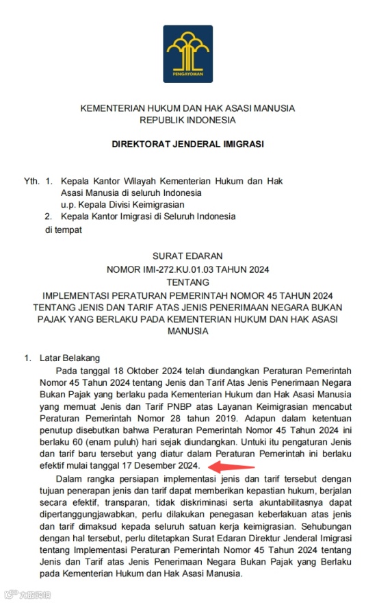 12月24日消息,印尼签证重大调整。12月17日开始,印尼落地签只有B1旅游,B2商务落地签退出历史舞台。2024年10月18日,印尼政府颁布了第45号政府条例,对移民服务的官费(PNBP)类型和关税进行了修订,并于2024年12月17日正式生效。