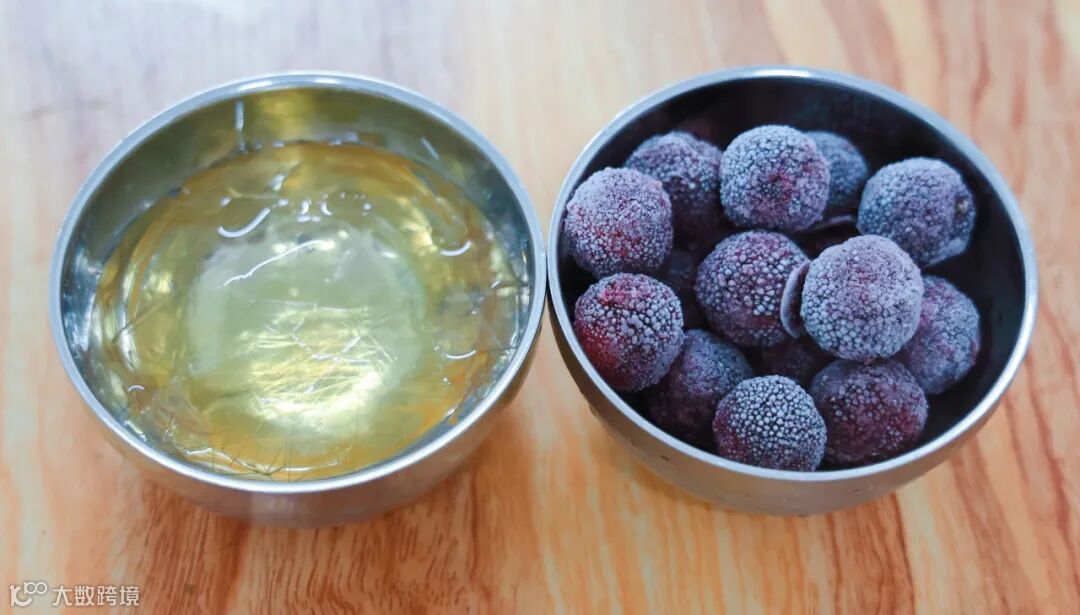 取出2片吉利丁片,剪成小块放入冷水中软化,同时将冰冻杨梅置于室温下解冻。