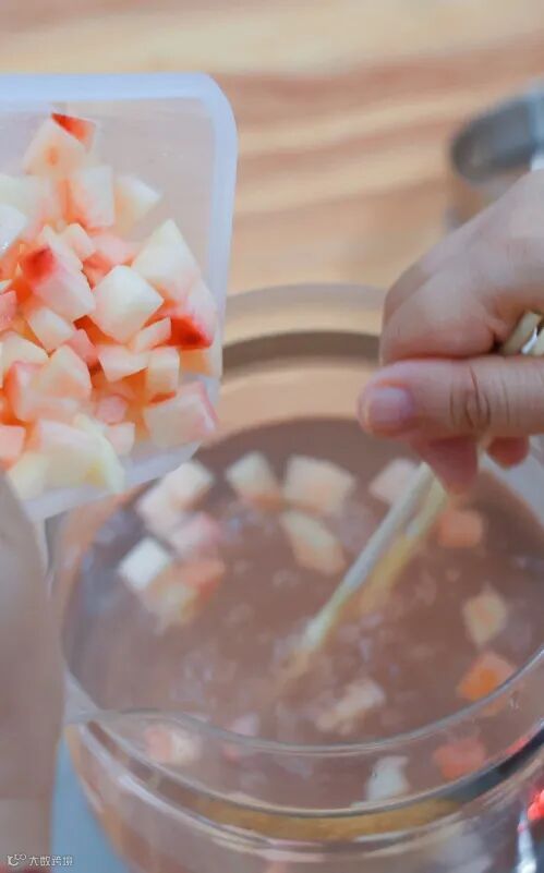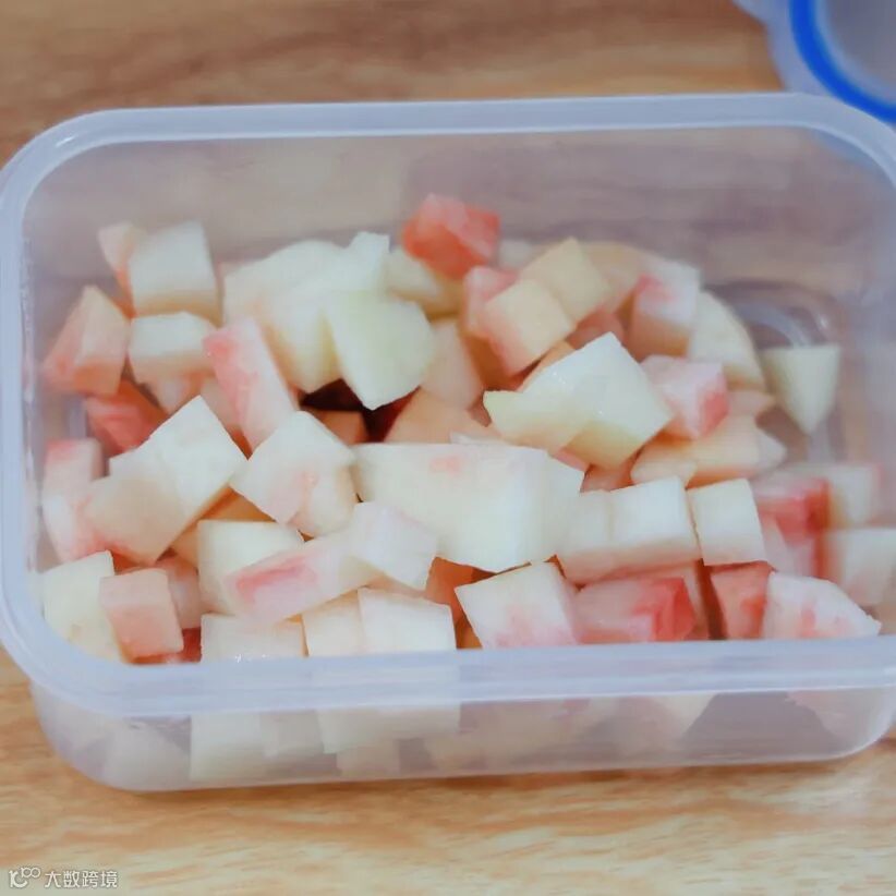 用盐水洗干净桃子,去皮,将桃子皮放入800-1000毫升的冷水中,加冰糖烧开。把桃子果肉切丁,加几滴柠檬防止变色,备用。