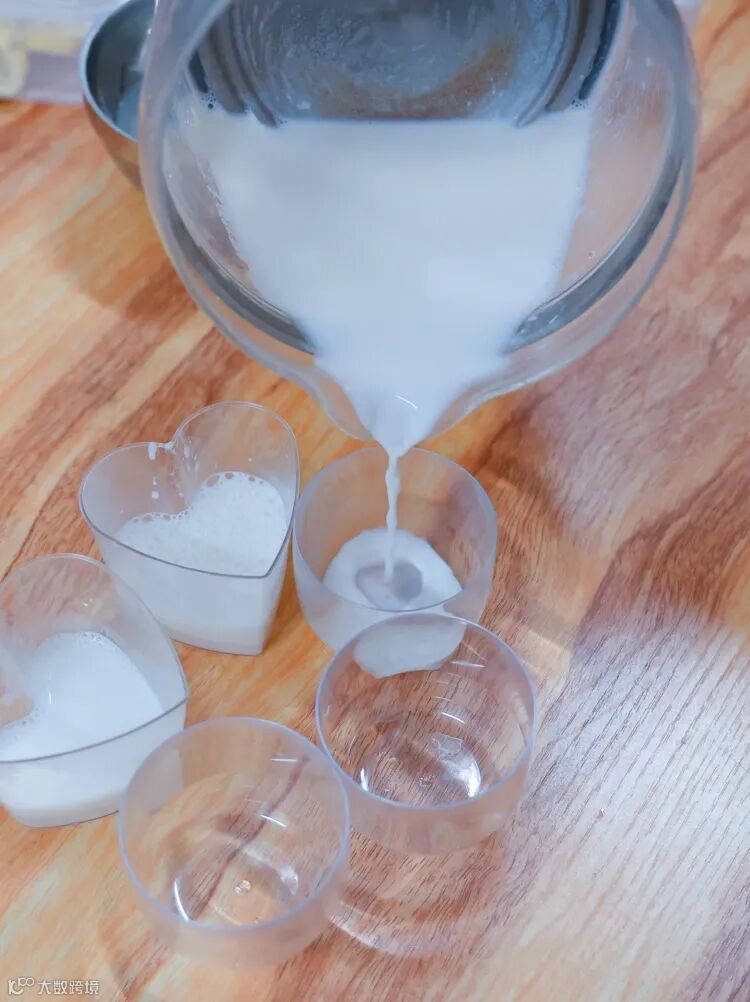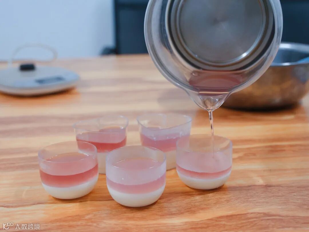 冷却到常温后,将杨梅捞出。从冰箱取出已凝固的牛奶冻,倒入杨梅汁,继续冷藏1小时。