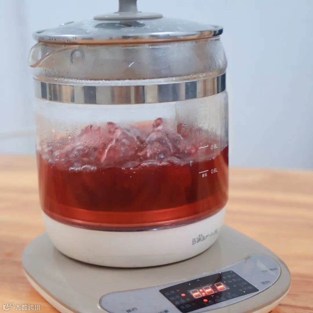 将杨梅和冰糖倒入锅中烧开,可以加一小勺子的红糖,更易显色。