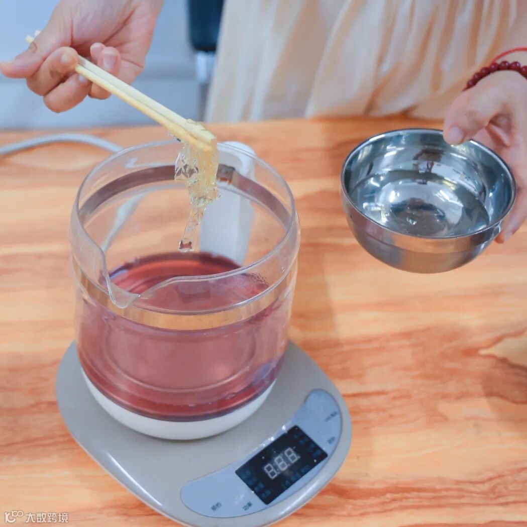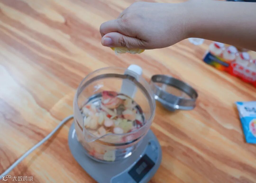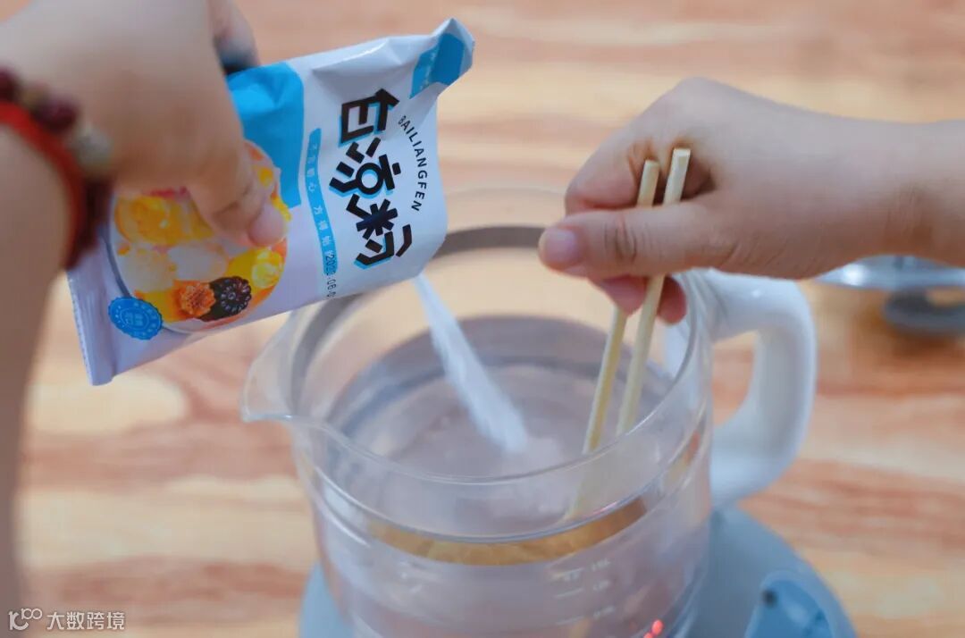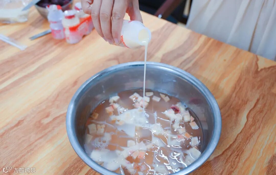 水烧开后把果皮捞出来丢弃,在开水里倒入一包白凉粉,搅拌至无色后继续搅拌1-2分钟,加入切好的果肉。