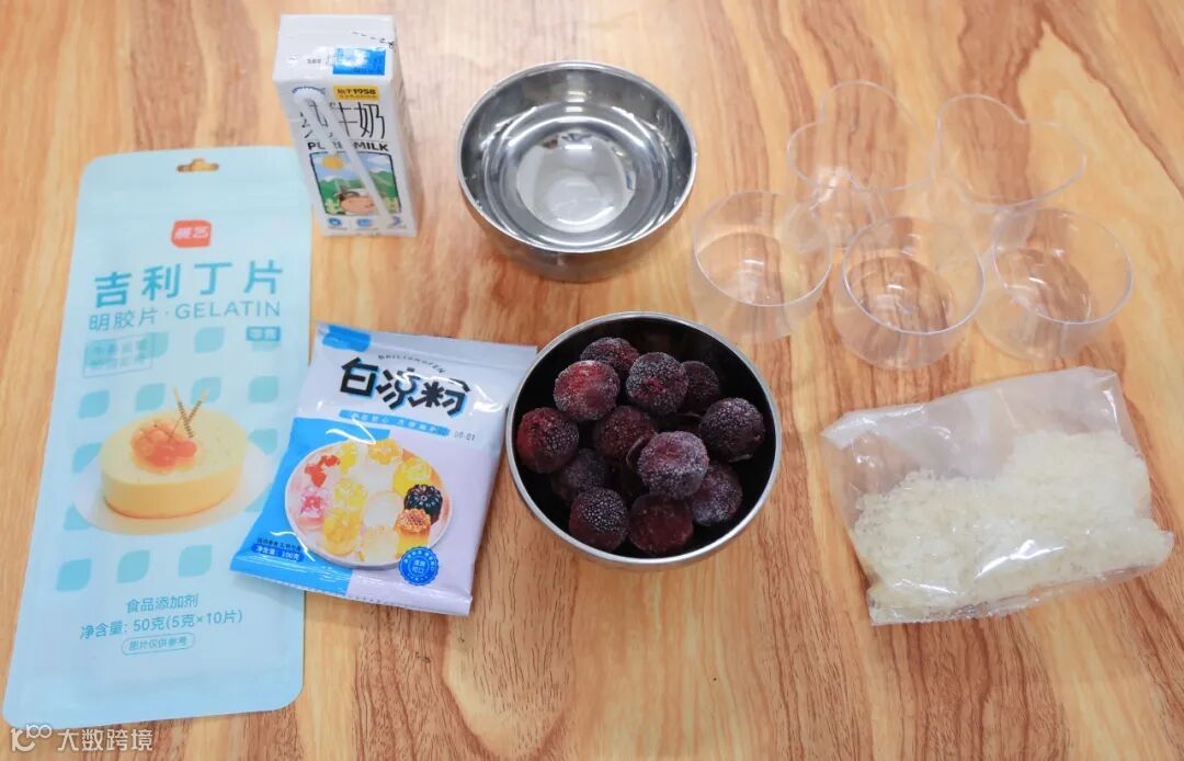 吉利丁片、纯牛奶、冰糖、冰镇杨梅、小杯子