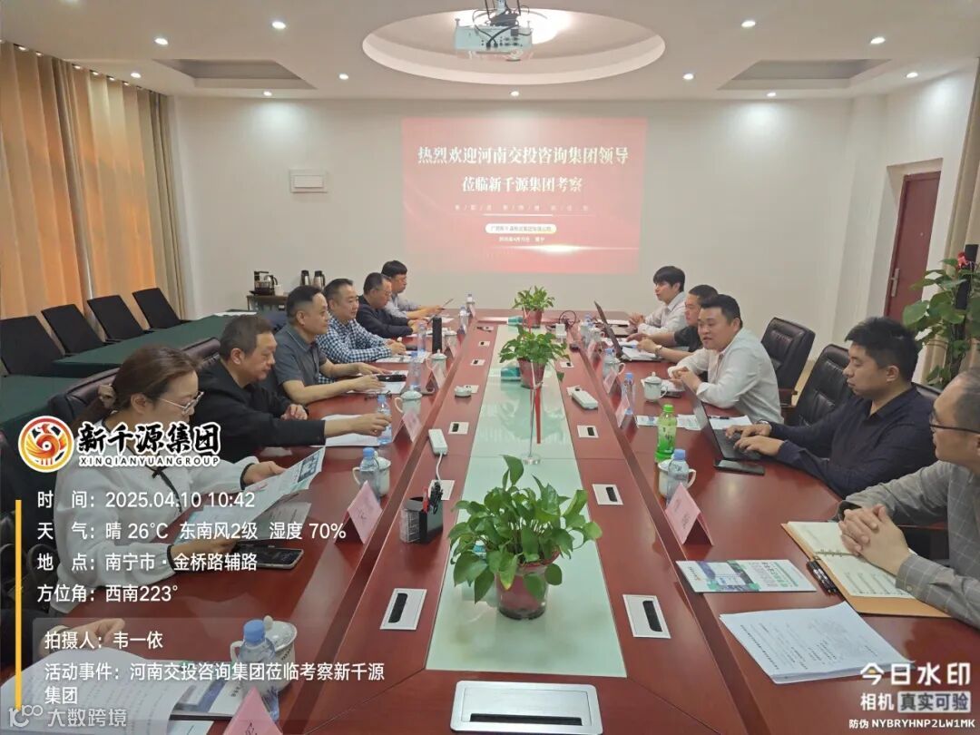 2025年4月10日,河南交通技术咨询集团有限公司总经理张兵、副总经理李宏郑、副总经理程航、总经理助理焦斌、河南中宇交通科技发展有限公司董董事长、河南交投设计咨询有限公司总经理陈猛一行莅临考察广西新千源集团南宁大汇园区及二塘园区总部,双方围绕业务发展、合作机遇等内容展开深入交流,为推动行业协同发展注入新动力。