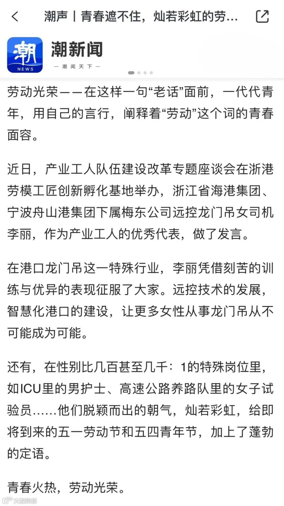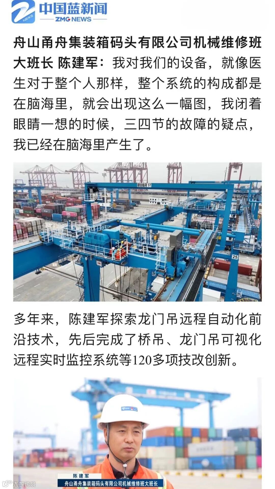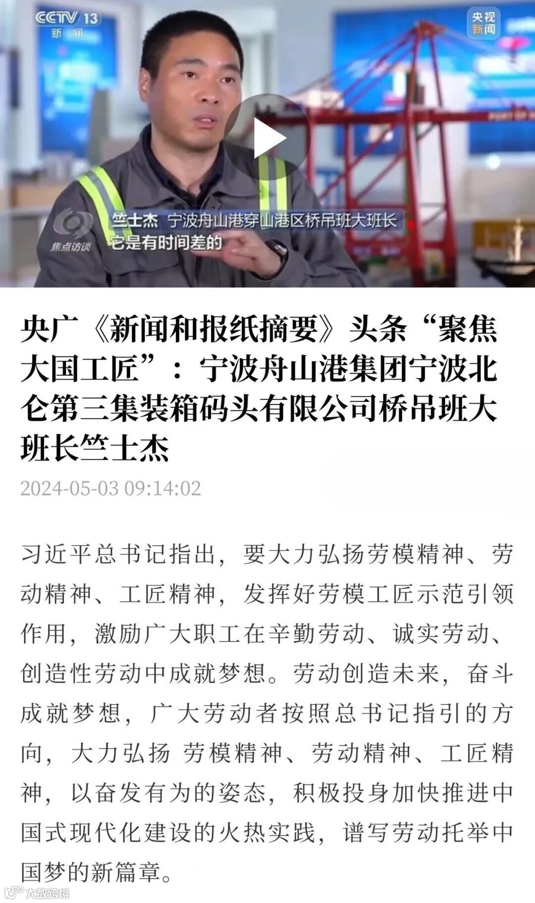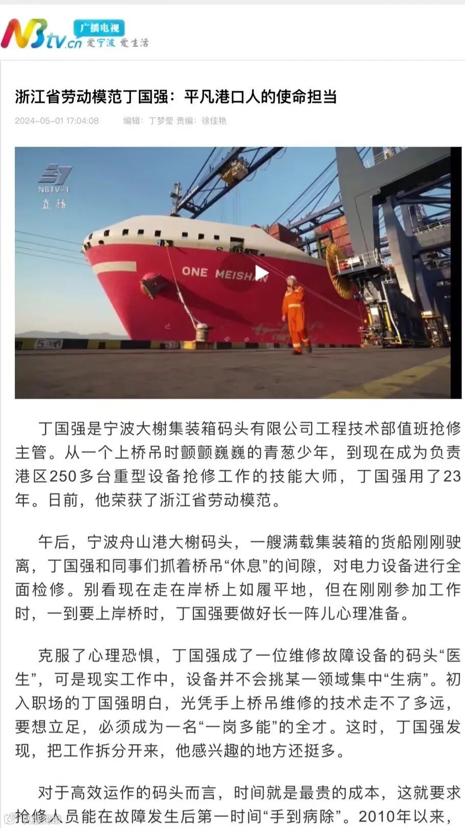5月1日、2日,央视《晚间新闻》《新闻直播间》先后播出报道《奋进的中国 奋斗的时代·数据看劳动创造》《数据看劳动 感受中国创造力》,其中关注了宁波舟山港的一组数据:90秒抓取一个集装箱,宁波舟山港的桥吊司机远程操控4公里外码头上的桥吊轻而易举,高空作业逐渐向远程操控转变。