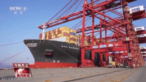 5月5日,央视《晚间新闻》栏目播出报道《盘点“五一”假期 流动的中国 处处涌动蓬勃生机与活力》,其中关注假日期间的港口码头一派繁忙景象,在宁波舟山港,不到两分钟,一个集装箱就在货轮和卡车之间完成交接,每天有超过10万个标准集装箱在这里进出。