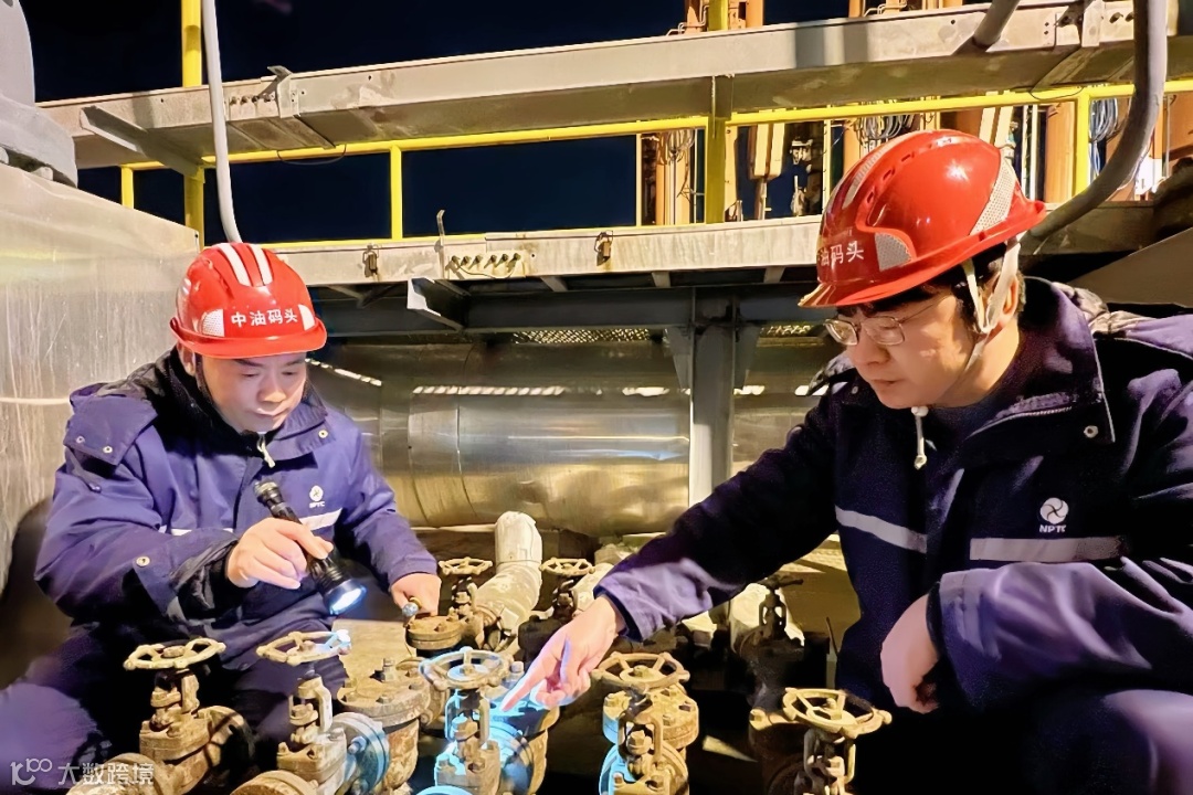 夜幕下的原油码头机器轰鸣、原油奔流,相互交织成了一首劳动协奏曲。巡检员们手持巡检仪器,沿着输油设施逐一检查。从输油臂至脱缆钩,从沿线管路到每个阀门和仪表,不放过每个角落。他们是输油管路上忠实的“倾听者”和敏锐的“观察者”,为排除安全隐患时刻捕捉着异常声响或振动,保障着油码头安全稳定。