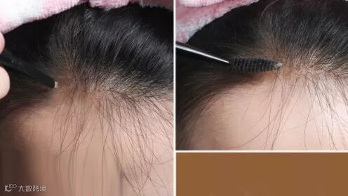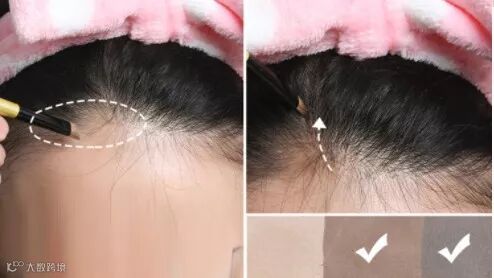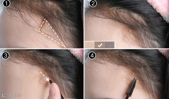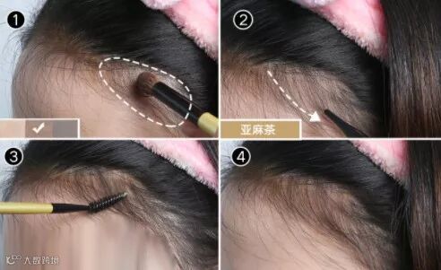 用和发色接近的眉粉,随意地涂抹在额顶处。就是真的随意涂抹就可以,这样出来的效果才会以假乱真。