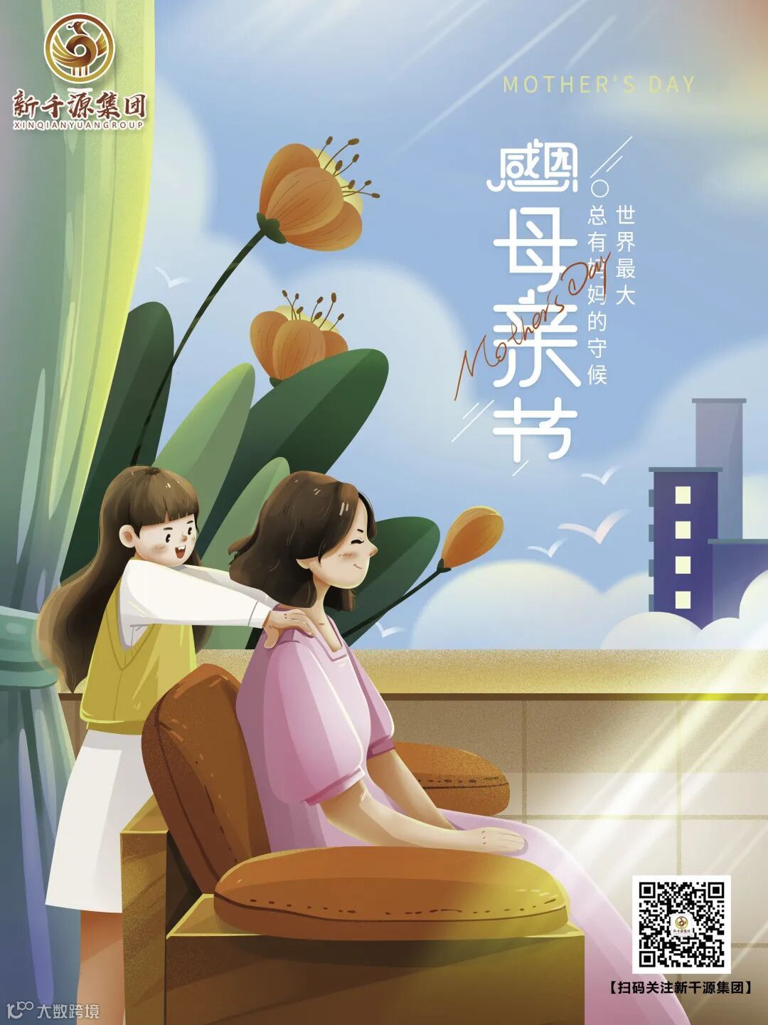 母爱是一片树林,遮风挡雨伴我安寝;母爱是一把古琴,悠扬弹奏给我温馨;母爱是一潭甘霖,香甜如蜜任我细品。把爱化成一条短信,感谢我们敬爱的母亲,新千源集团祝所有母亲节日快乐!
