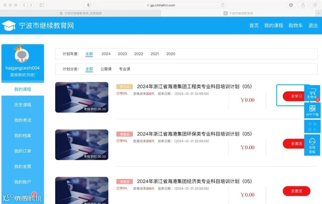 选择“我的课程”,找到带“浙江省海港集团”字样的专业科目培训计划,选择“去激活”,然后点击“去学习”,开始学习必修课程。