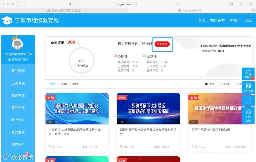 完成必修课学习后,点击“立即选课”进行选修课课程选课。