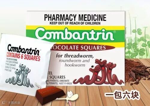 Combantrin驱虫巧克力,主要成分为双羟萘酸噻嘧啶,它属于广谱抗蠕虫成分,系去极化型神经肌肉阻滞剂,通过抑制胆碱酯酶,对寄生虫的神经肌肉产生阻滞作用,能麻痹虫体使之止动,并安全排出体外,不致引起胆道梗阻或肠梗阻。