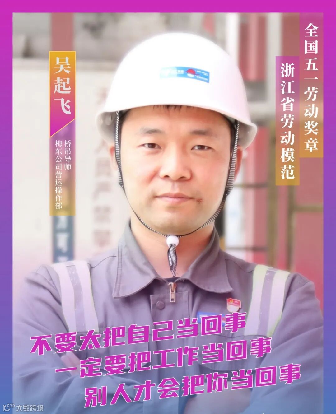 他始终坚定理想信念,刻苦磨练技术本领,立足岗位矢志创新,奋斗在码头一线10余年,凭借肯钻的劲头和过硬的技术本领,一步一个脚印,从一名职校生成长为全国冠军。他注重技能人才的培养,先后提炼总结出《起飞远控桥吊操作法》《“智飞”远控龙门吊操作法》,为远控司机培训提供了一套可复制、可推广的“梅东方案”。曾荣获全国交通技术能手、全国青年岗位能手、浙江省国资国企系统“优秀共产党员”、浙江工匠等荣誉称号。