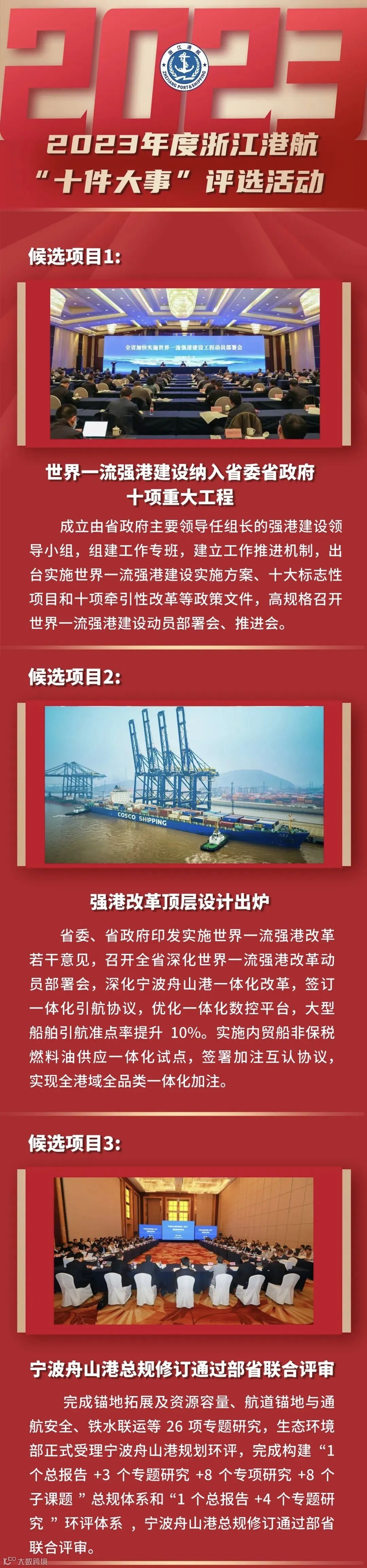 近日,2023年度浙江港航“十件大事”投票评选开启,浙江省海港集团、宁波舟山港集团报送的项目入围候选名单。