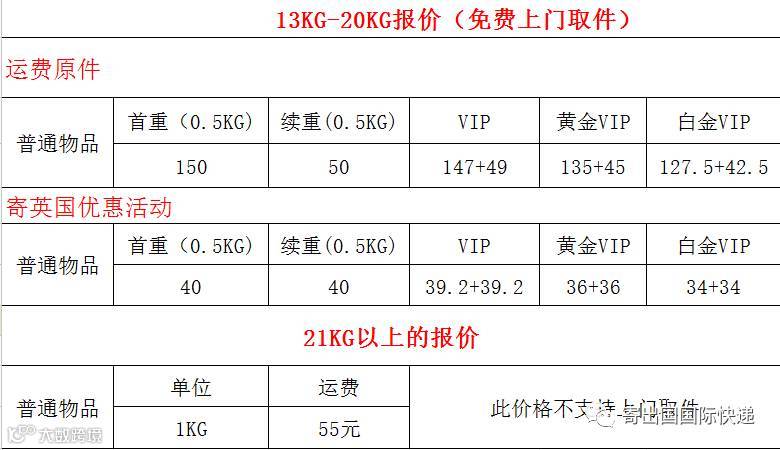 寄出国集运好消息!从8月1日开始,寄往英国超实惠活动开始啦!这是有史以来最优惠的活动,此活动只针对13KG以上的普通物品。特殊物品按照原价来优惠 ,新客户9折,老客户折上折。以下是活动价格!