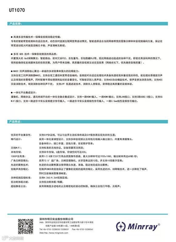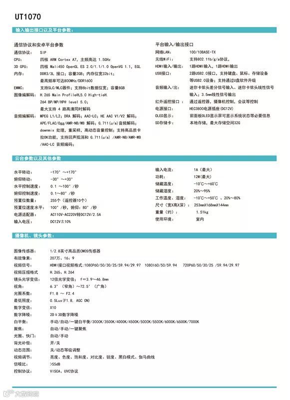 信息通信类一体机UV1202摄像机具有5倍/10倍/12倍/20倍等多倍光学镜头;最大广角无畸变视角为83.7°;先进的ISP处理技术和算法,使得图像效果生动逼真、光色层次感强、色彩还原性好。多应用于互联网+党建、党员培训、智慧政务、防恐维稳、应急指挥、双师教育等应用场景。