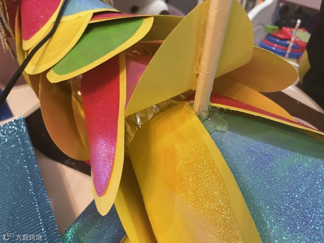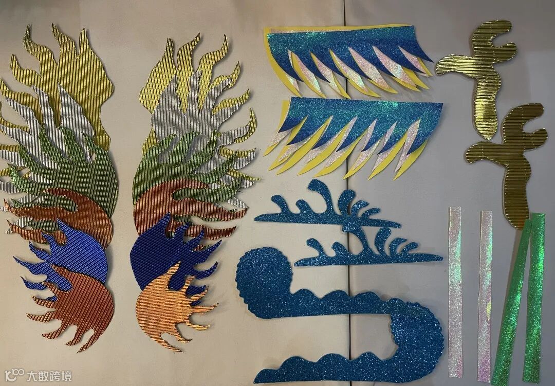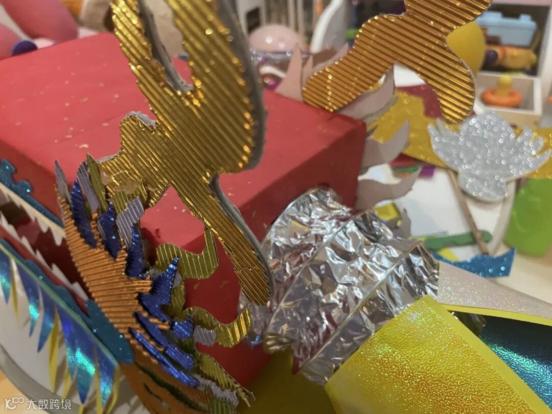 3.剪出龙前端的胡须及花纹(毛发)形状,贴到龙头前方,胡须使用彩色珠光纸,长短渐变,分三层粘贴,更有层次感。