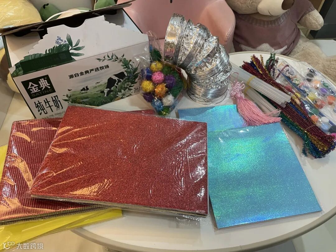 准备材料:牛奶箱、烟管(直径10厘米,长度1.5米)、珠光纸、卡纸(或使用金粉海绵纸和彩色瓦楞纸增添亮色)、扭扭棒、毛球、热熔胶、双面胶、小木棍、剪刀。