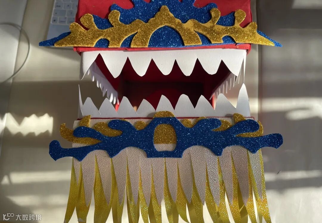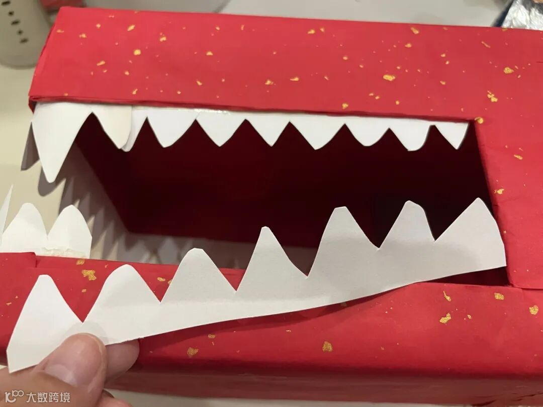 2.用白色的卡纸剪出龙的牙齿,并使用双面胶延边贴在嘴巴开口处。