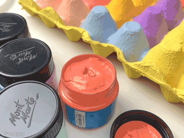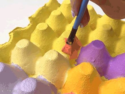 蘸取丙烯颜料给蛋托涂上自己喜欢的颜色。