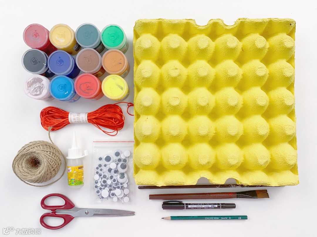 纸质鸡蛋托、丙烯颜料、画笔、剪刀、毛线、双面胶、“眼睛”贴纸等。
