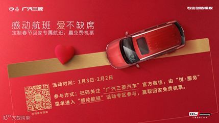即日起,只需关注“广汽三菱汽车”官方微信,选择“悦·服务”菜单进入“感动航班”专区参与活动,即有机会赢得广汽三菱送出“感动航班”免费机票。在2月8日“小年”,广汽三菱将派出专机,助游子们踏上回家的旅途。