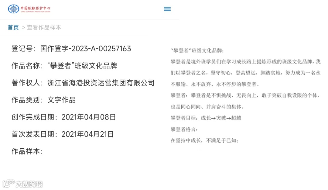 著作权登记证书是国内外一流企业尊重知识产权、注重企业品牌建设的金名片,是法定的权利证书,发生争议或者侵权时可以直接作为法定证据请求司法保护。此次申请成功的18张著作权登记证书分为美术作品、音乐作品两大类别,包含了集团合规文化,境外班班级精神、班级理念、班徽、班歌、班旗、班级誓词,“攀登者”班级文化品牌、攀登者吉祥物,“90°青春”班级文化品牌等内容。所有作品均为集团干部职工在相关工作中总结、提炼、创作、设计的智力成果,是全集团宝贵的精神财富。集团及时向国家版权局申请著作权登记证书,从法律上确认了集团将永久持有相关作品的署名权、修改权、保护作品完整权等民事权利。